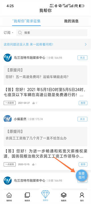 2、在【我帮你】页面,点击右下角蓝色【我要提问】按钮,进入提问编辑界面。