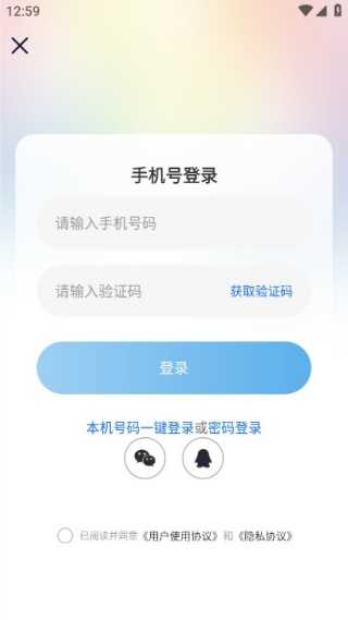 2、输入手机号码获取验证码登录使用,同时支持微信、手机qq授权登录。
