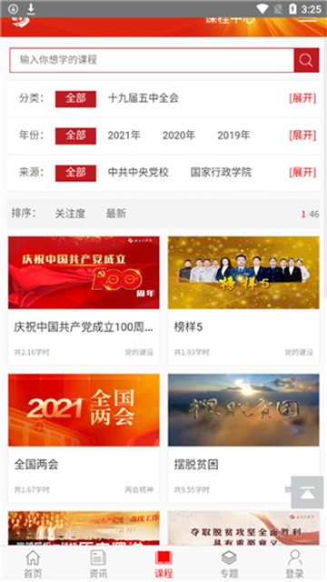 2、进入课程中心,可按分类、年份、来源精准筛选课程,也可通过顶部搜索框直接输入课程名查找。点击课程封面即可进入学习。