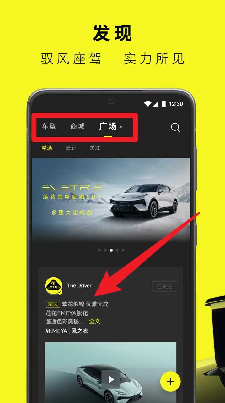 2. 点击底部广场标签,浏览精选内容、车型资讯与车主动态,支持关注发布者并互动评论。