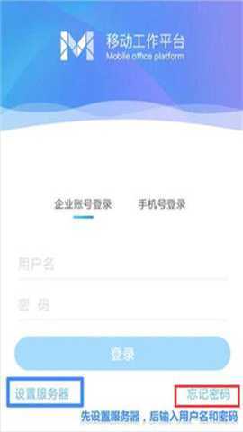 1、打开已安装的M3移动办公软件后,进入登录页面,首先设置服务器,再输入账号和密码。点击“设置服务器”。