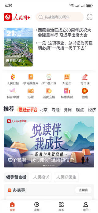 人民网是一款值得大家自主学习的新闻资讯阅读软件,提供了在平时日常的生活中科普一些必要的要素、不仅有热门资讯、辟谣求真等众多服务版块,更是为用户带来了大量实用信息和数据,给大家的日常生活中添加丰富的头彩。该应用汇集了多个为民服务的互动版块,如“领导留言板”、“人民维权”和“人民优选”,为用户提供生活科普、辟谣求真、安全提示等实用的民生服务类资讯和数据库。