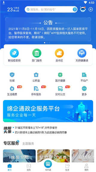 1、打开“i绵阳”APP,在“首页”中的“专区服务”找到“预约通告专区”主题服务栏。