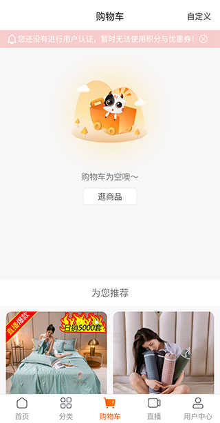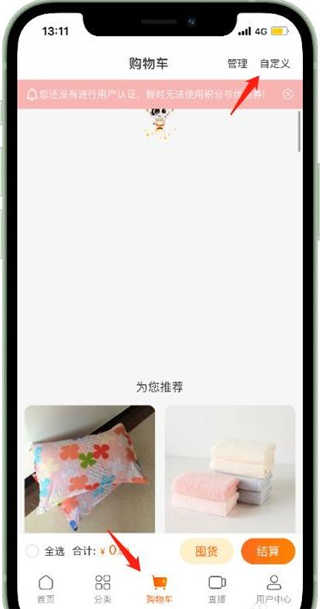 1、打开APP,选择下方购物车,然后点击右上方自定义。