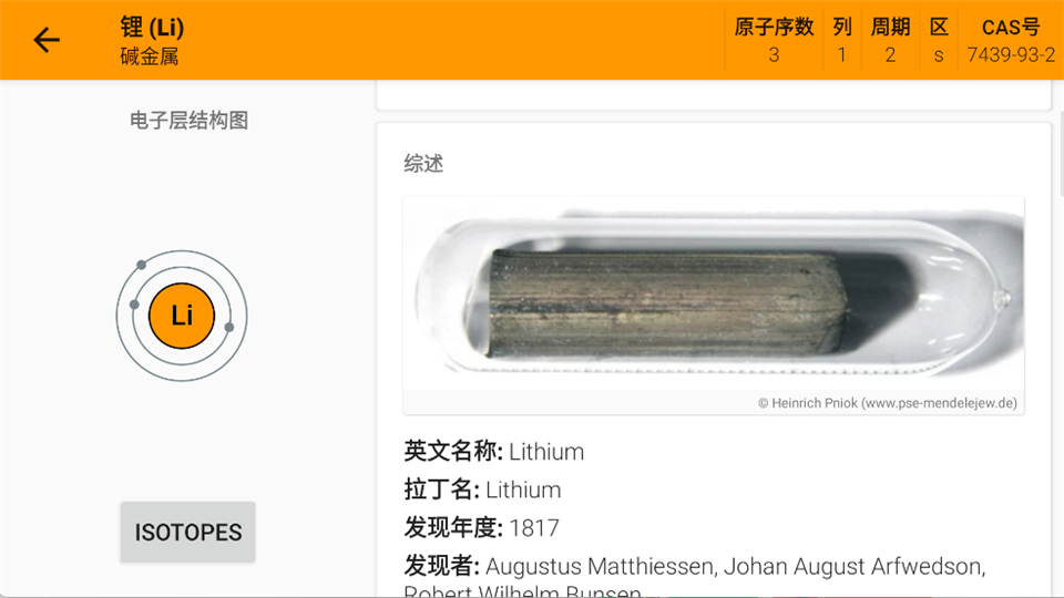 2、进入元素详情页,可查看电子层结构图、实物图、发现历史等深度信息,全方位了解元素特性。