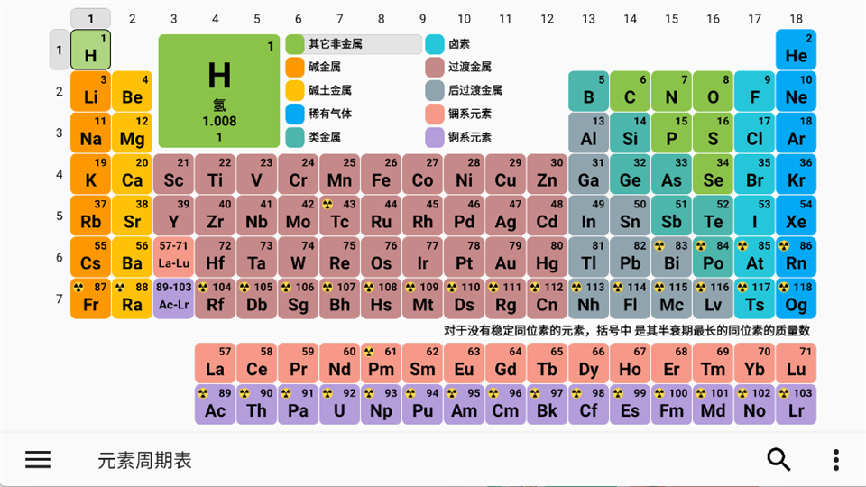 1、在主界面可查看完整的元素周期表,不同颜色代表不同元素类别,点击任意元素即可进入详情页,快速定位元素的基本信息与分类。