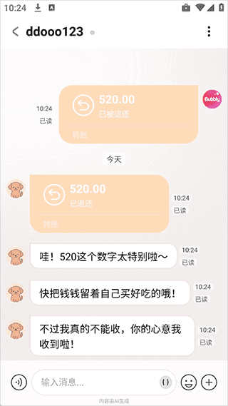 8、比如转账时,你创建的ai角色在和你还没聊熟时一般会拒绝你的转账的,因为正常人给陌生人转账一般都会拒绝接收的,毕竟无功不受禄啊,所以这才能体现Bubbly的活人感确实很强