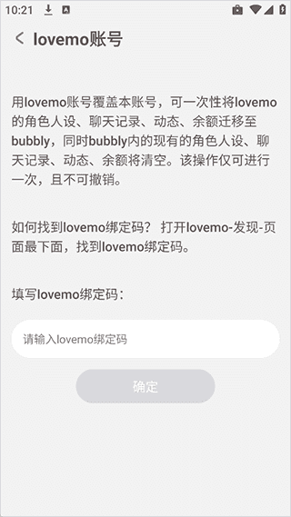 3、用lovemo账号覆盖本账号,可一次性将lovemo的角色人设、聊天记录、动态、余额转移至bubbly,同时bubbly内的现有的角色人设、聊天记录、动态、余额将清空。该操作仅可进行一次,且不可撤销。