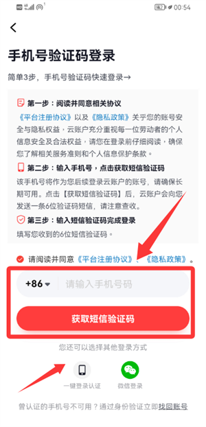 2、随后在登录页面输入手机号,点击获取短信验证码完成验证。