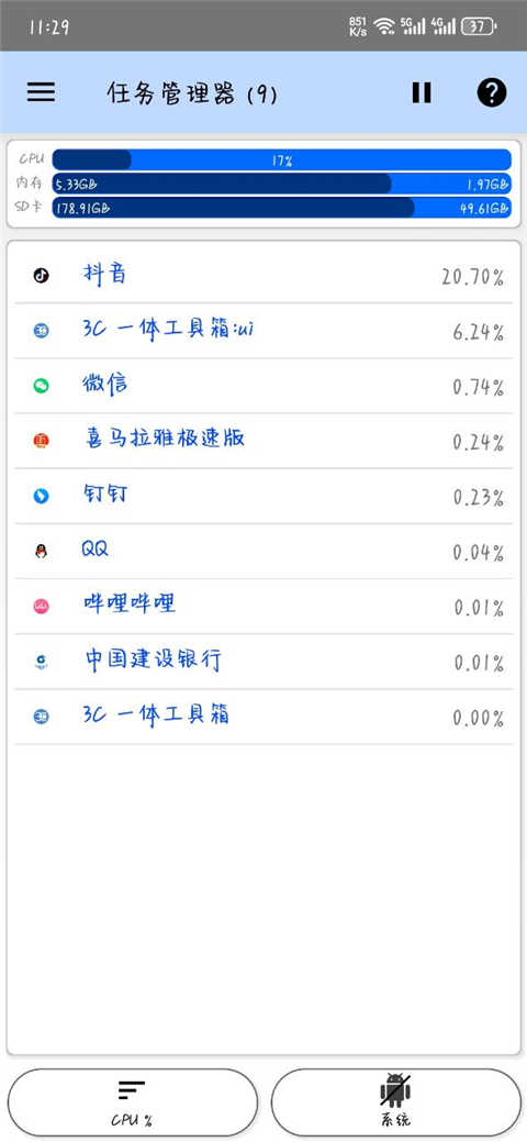4、任务管理器授权后,可实时查看设备当前运行的软件情况以及CUP、内存情况