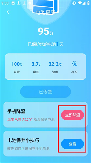 4、在电池健康界面,点击【立即降温】按钮,也可点击【查看】按钮学习电池保养小技巧。