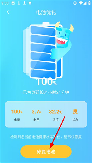 2、在电池优化界面,点击【修复电池】按钮,可改善电池健康状态。