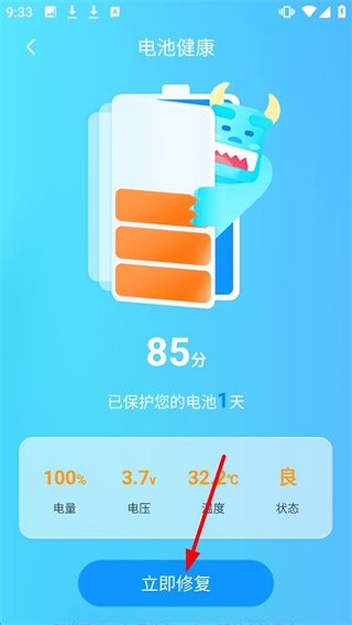 3、在电池健康界面,电池评分为85分时,点击【立即修复】按钮,可维护电池健康。