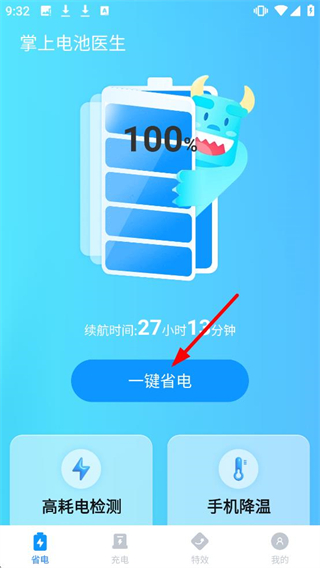 1、在掌上电池医生界面,点击【一键省电】按钮,可优化电池以延长续航。