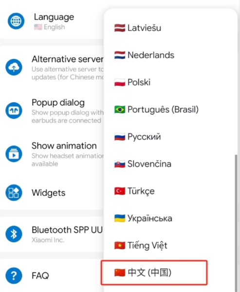 运行My Buds M8后,如果是英文界面,那你需要点击主页面右上角的齿轮设置。然后在Language中选择【简体中文】。