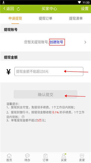 4、进入页面后,要是已有账号就可以直接输入提现金额提现,要是没有就要先创建一个收款账号。