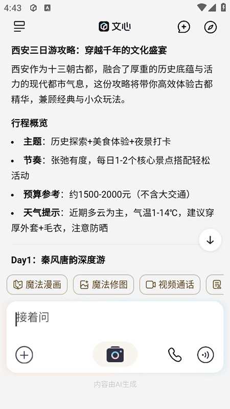 1、首页点击“搜索框”,输入“西安三日游攻略”,或长按麦克风“语音提问”;