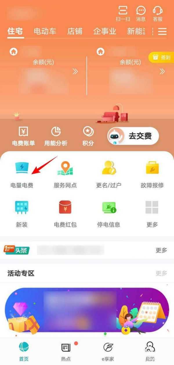 2、打开APP默认页面为首页,主要是用电账户余额和业务入口,点选电费电量。