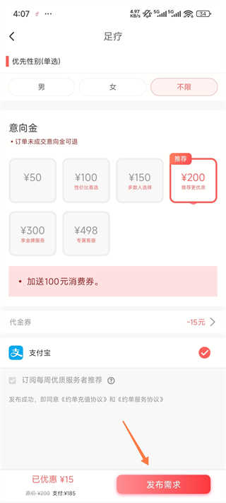 4、选择意向金,点击发布【订单未成交意向金可退】