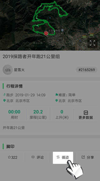 譬如通过六只脚地图首页的搜索框,寻找自己需要的靠谱的线路,如2019探路者开年跑21公里组,轨迹编号,2165269。