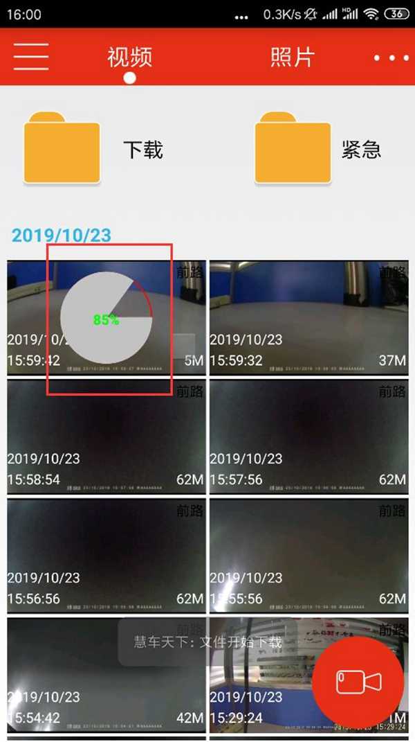 4、在手机里找到下载好的惠车天下APP,点击打开之后,再点击行车记录仪的录像标志,便可以查询实时视频;