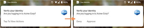 当屏幕上显示 Duo Push 通知时,轻触指示的位置以查看可用操作:批准或拒绝。