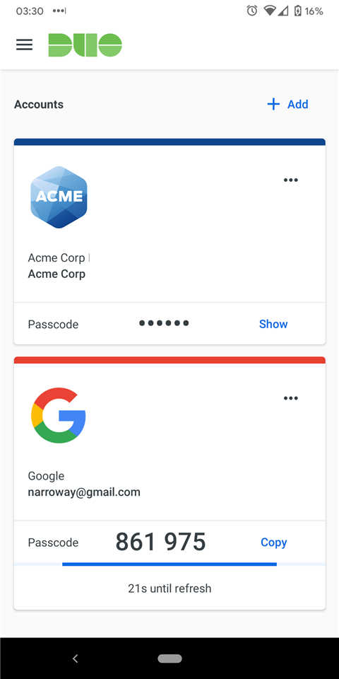 您将在账户列表中看到新添加的 Duo 账户。现在,您可以响应 Duo Push 身份验证请求,或生成密码以登录应用。