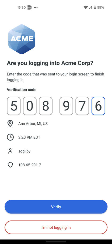 在 Duo Mobile 中输入屏幕上显示的验证码,然后轻触验证以批准登录请求。