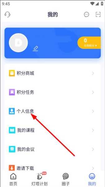2、在我的页面中有积分商城/任务、个人信息、我的课程、我的会议等设置,点击个人信息;