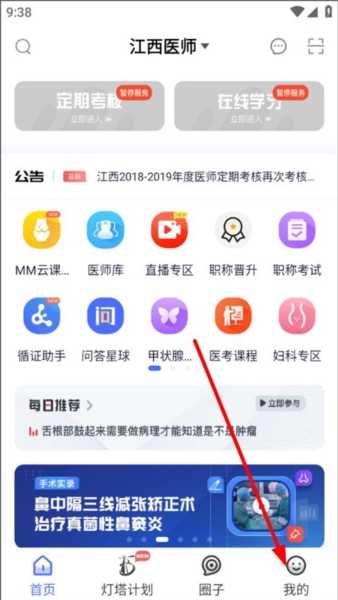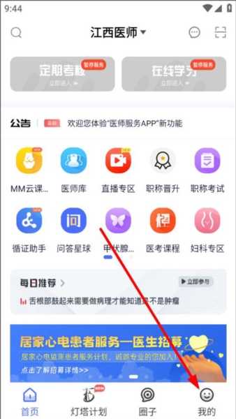 1、打开医师服务app,进入首页,首页有定期考核、在线学习、公告、热点推荐等,点击我的;