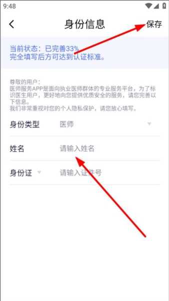 4、打开身份信息页面,用户需要填写身份类型、姓名、身份证件号,填写完成后点击右上角保存;