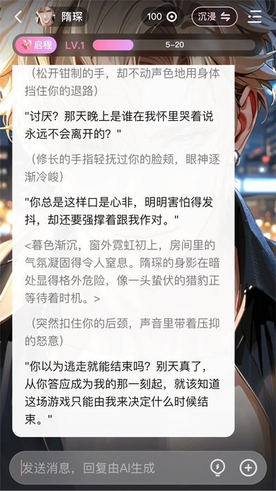 2、沉浸式长文模式:该模式注重对话的深度和细腻度,AI会生成较长且富有细节的回复,适合恋爱模拟、角色剧情等场景。用户可以感受到更加真实、生动的互动体验,仿佛与真人进行深入交流。