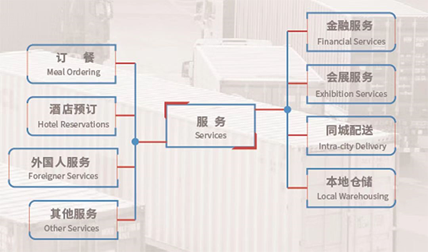 服务:订餐、酒店预订、外国人服务、其他服务、金融服务、会展服务、同城配送、本地仓储。