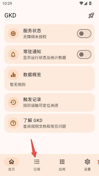 1、导入前首先进行授权操作,操作如下:打开后进入GKD的首页, 要想GKD正常工作需要授权无障碍权限,点击无障碍权限右侧的 授权 按钮即可前往设置的无障碍界面授权以Xiaomi HyperOS为例,如下两图就是操作方式。