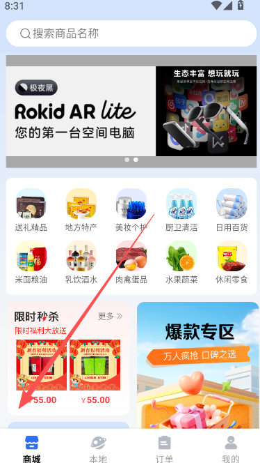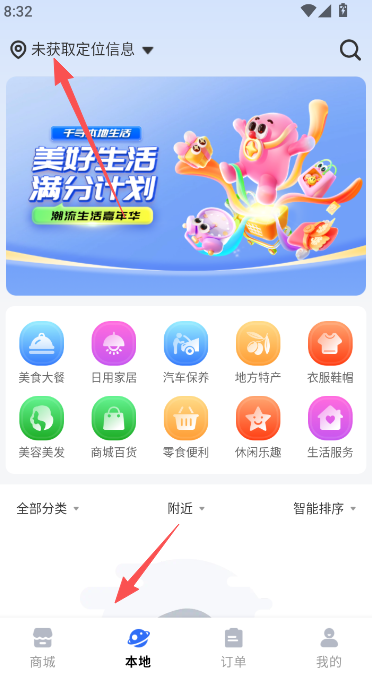 3、使用本地版块,需要先获取定位权限部分,获取完成以后,来到该页面,可向你推送附近的商品类活动,随时在线参与。