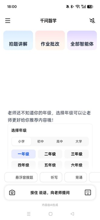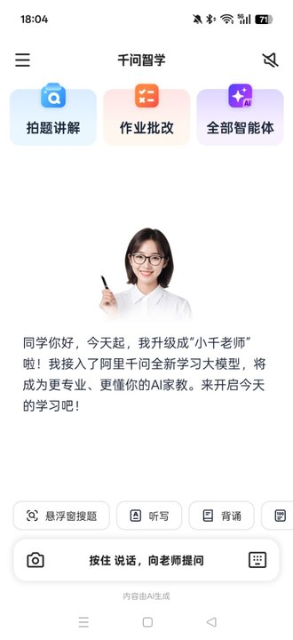 千问智学是一款AI智能辅导工具,以“AI+教育”为核心,将传统学习流程转化为沉浸式互动体验。其虚拟人老师具备自然生动的表情与语音交互能力,支持多轮深度对话,覆盖古诗文背诵、数学函数解析、英语发音纠正等全学科场景,采用启发式教学替代填鸭式灌输。软件以虚拟AI老师小千的形式进行一对一的问答形式,帮助孩子们解决学习闪的困难,同时巩固自身学习记忆能力,更好的提升自我,在考试中发挥出更好。