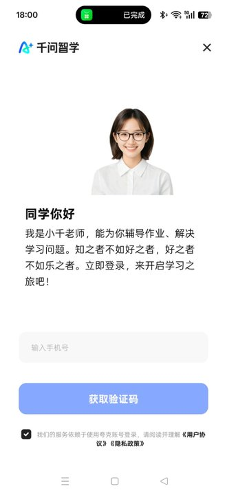 1、千问智学app的使用需要登录后进入,用户首次使用通过手机号码完成快速验证即可。