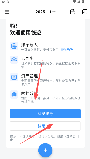 1、打开下载好的应用软件,点击登录账号或是试用一下进入,下方会有说明登录和试用的功能区别。