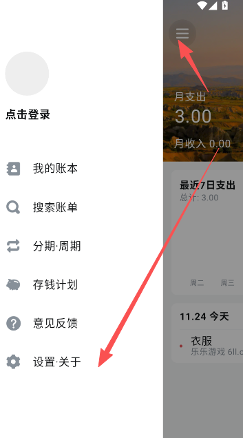 1、点击软件页面上方的横线处,在列表菜单中找到设置选项。