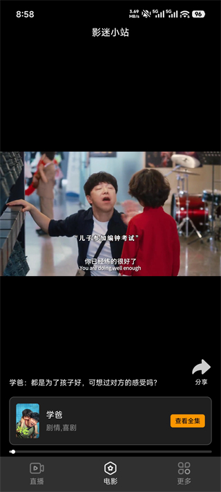 4、点击底部【电影】标签,进入影视专区,可直接观看《学爸》等热门影视资源,并支持全集浏览与连续播放。