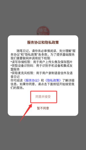 1、在随笔日记APP中点击"同意并接受",进入程序界面。