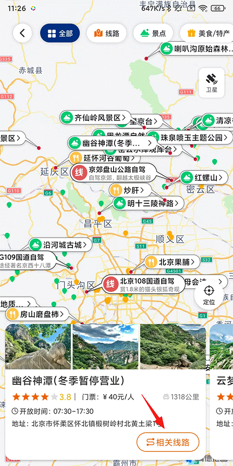 2、选择景区景点,接着点击下方的相关线路;