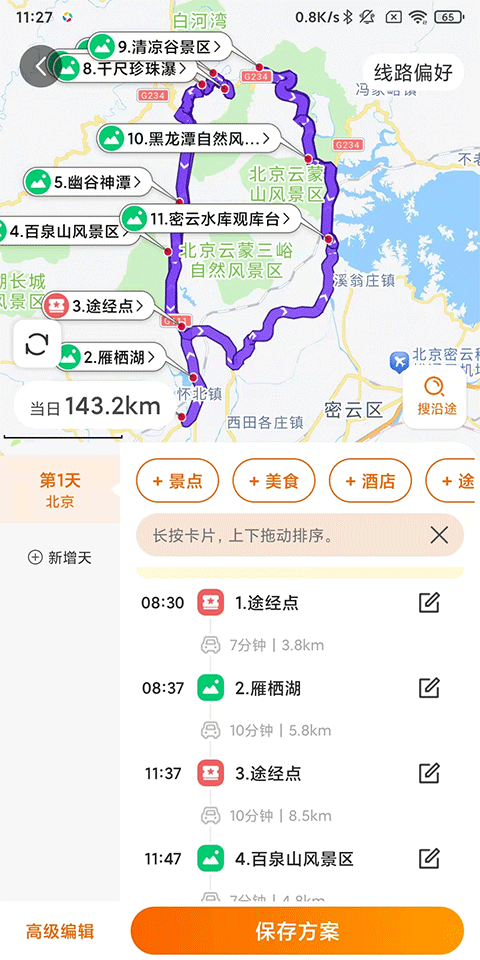 5、新增天数、编辑途经点、拖动排序位置等,完成后点击保存方案;