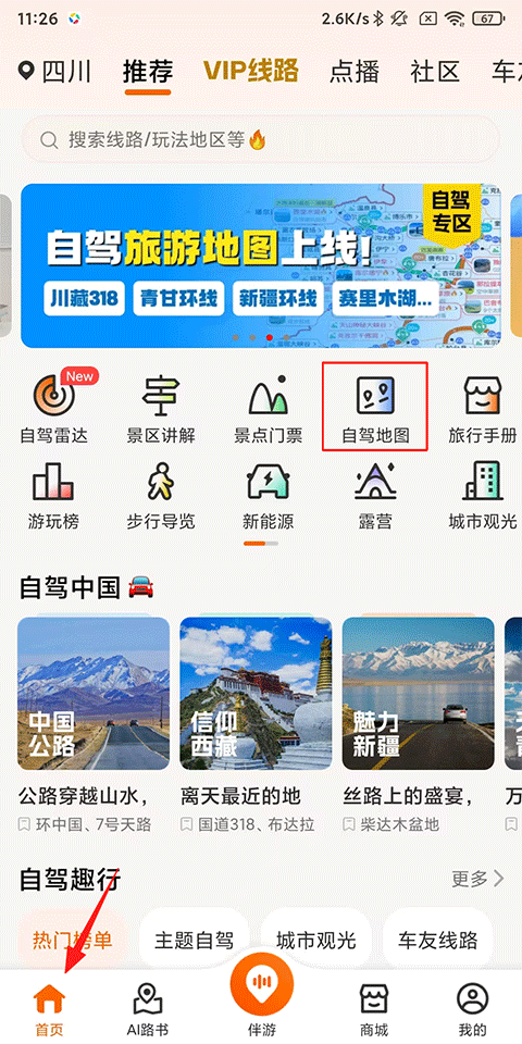 1、打开趣兜风APP,点击首页-自驾地图;