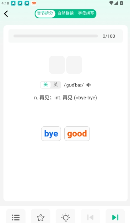 4.进入到单词拼写答题页面,可根据单词意思选择音节拼写单词完成答题