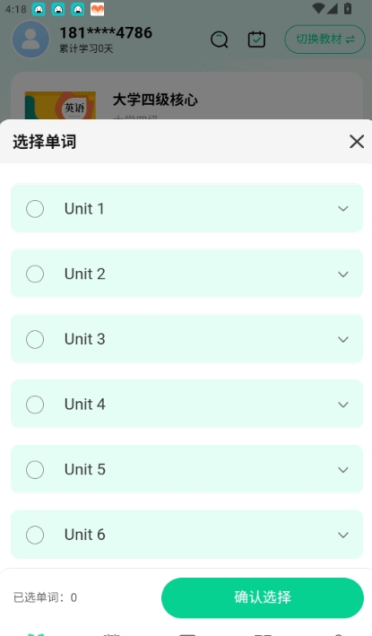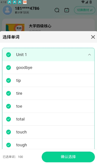 3.选择第一单元的单词后点击“确认选择”按钮进入下一步