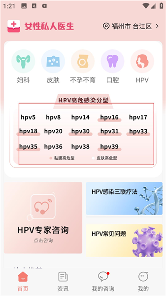 2、在提示弹窗点同意,跳转首页界面,用科室功能,查HPV高危分型,进专家咨询,看资讯,管我的咨询。