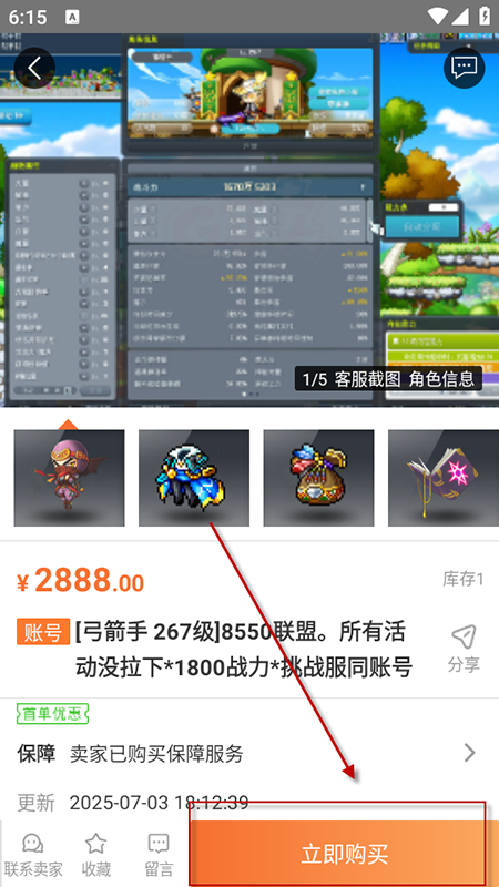 2、看中之后可以选择与卖家联系适当砍价或立即购买,支付完成后客服会与你联系,你可以要求客服将游戏账号的详细信息让客服截图给你