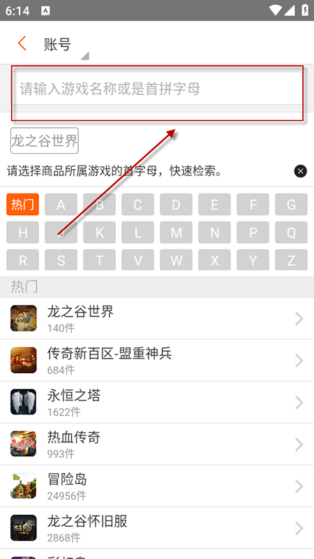 2、输入游戏名称或首字母,或按热门首字母筛选游戏。