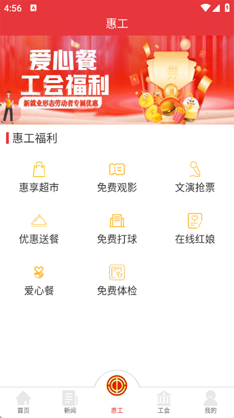 3、惠工页面提供了超市、观影、抢票、送餐以及打球等服务内容;